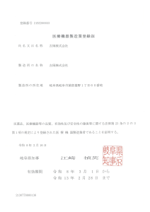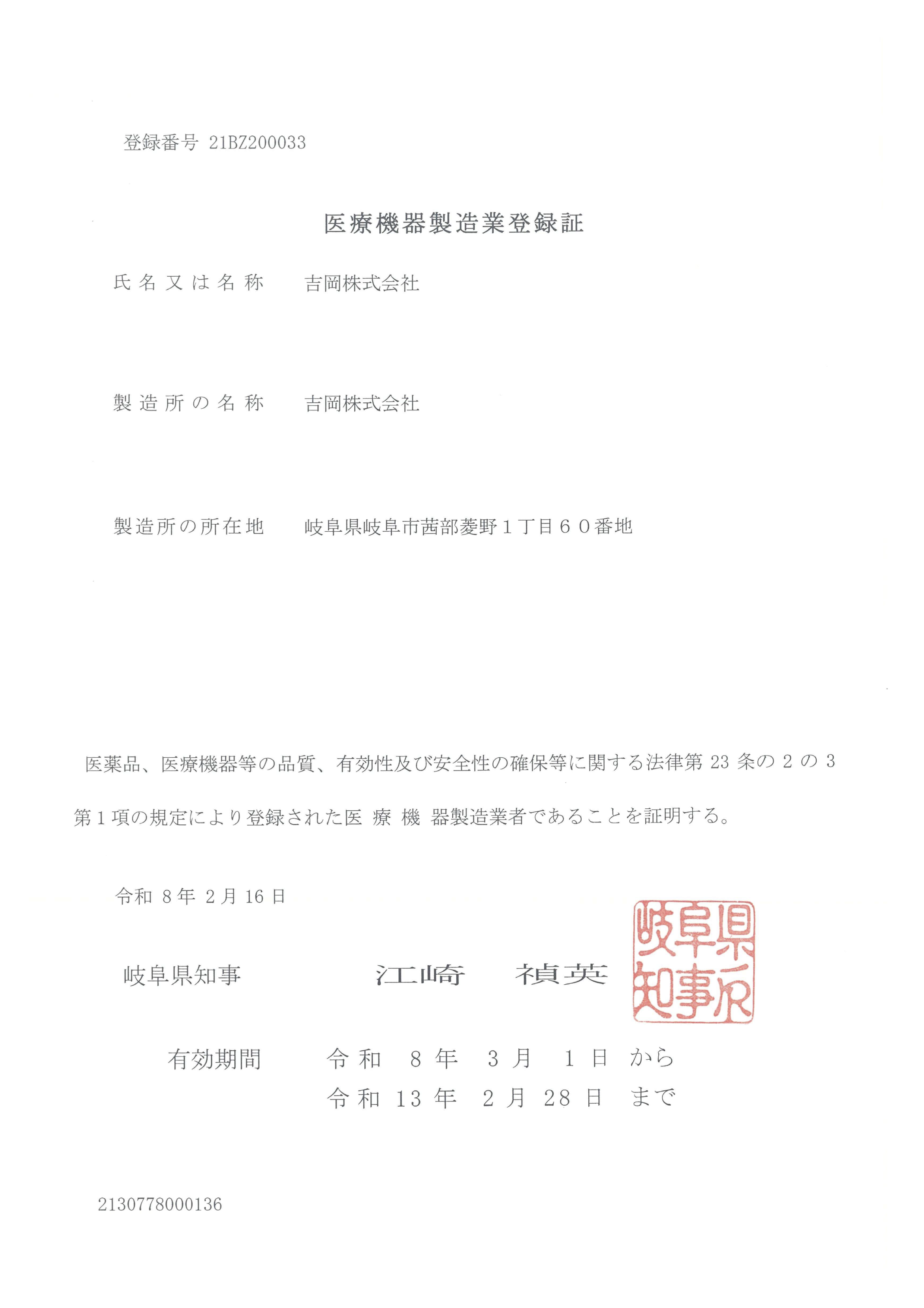 ■「医療機器製造業登録証」の詳細氏名又は名称:吉岡株式会社製造所の名称:吉岡株式会社製造所の名称:岐阜県岐阜市茜部菱野1丁目60番地許可番号:21BZ200033