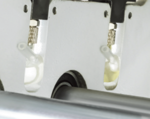 ◯ クリーンな駆動部: 新設計のアルミ合金バーとプレスプレートは、カムのないダブルスイング装置で制御。潤滑油による生地の汚れを防ぎます。