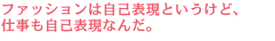 たとえば肩パッドというものがありますね。シルエットを保つためになくてはならないものですが、これ一つとっても、厚みや材質、デザインはそれこそ星の数ほどもあるわけです。お客様の要望に合わせて、ミリ単位で厚みを調整することもあれば、材質を変えていくこともしばしば。さらにデザインになるとセンスが問われますから、お客様の思いをどう表現していくかでさまざまな提案をしなくてはいけない。そういう提案を繰り返しながらアパレルメーカーと一緒にファッションを創造していくわけです。そこで必要なのは、自分の考えや感じ方を殺すことじゃなく、逆に自分をどれだけ出していくかなんです。吉岡で経験を積んでわかったのは、仕事もまた自己表現の一つなんだなということでした。 |